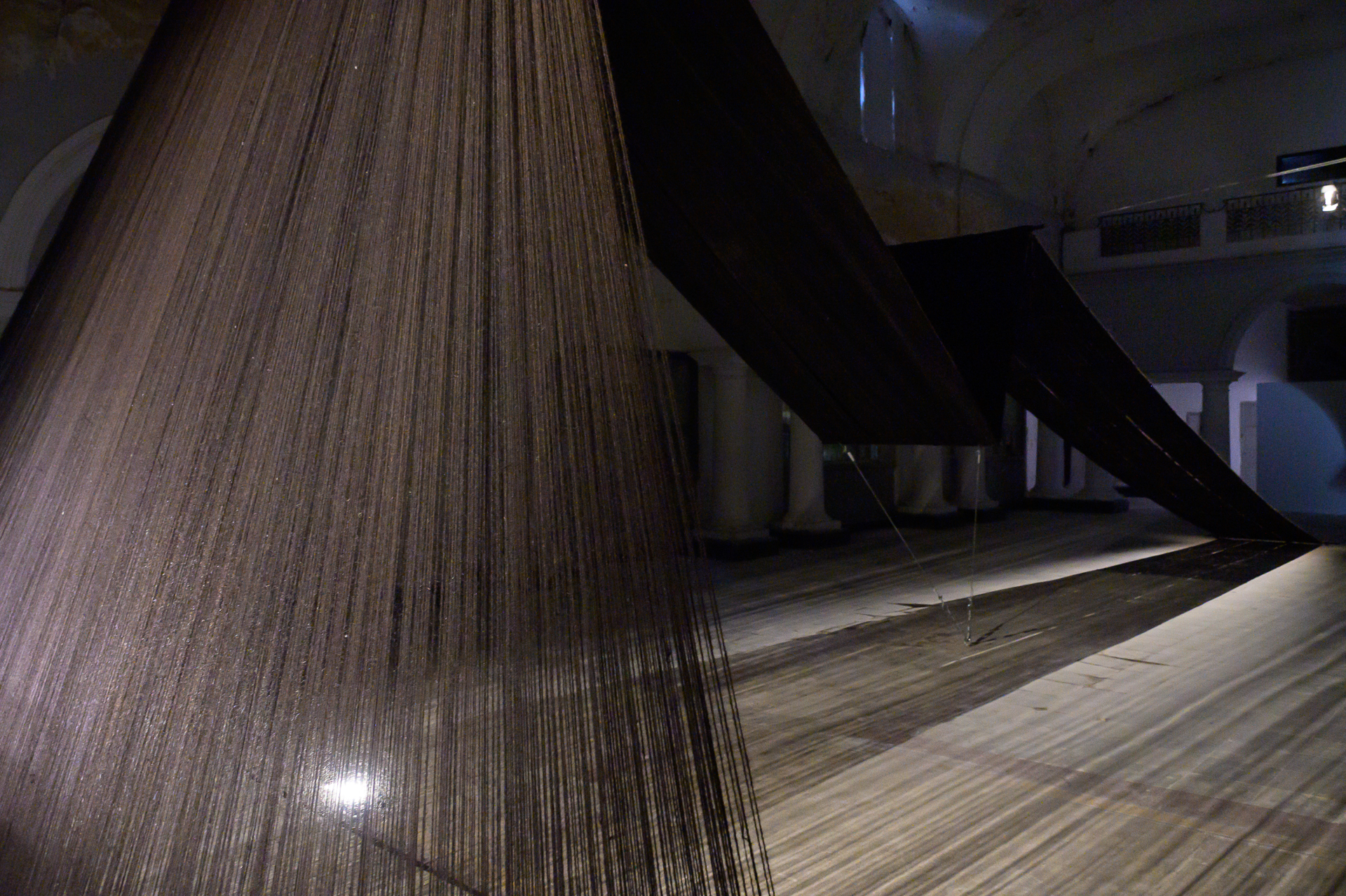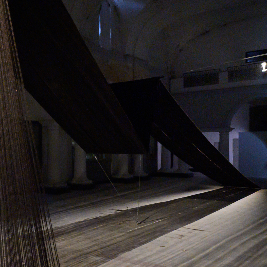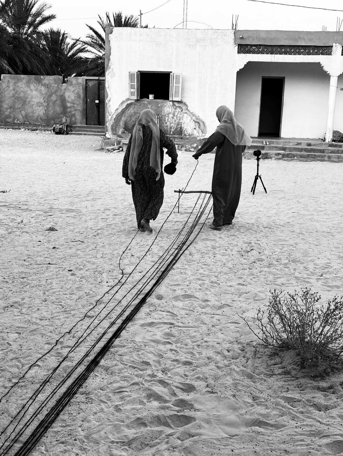 Rooted deeply in the earth, their art questions exile and belonging. It softly echoes the pain of endless coming and going. Weaving becomes a language of meaning—a living space where the gesture of each hand evokes displaced lands and stories of migration. A black thread, strong and tense, shapes matter into a voice, speaking universally about uprooting, grounding, and the enduring presence of the earth. A lifeline, steady and unchanging, transcending space and time.