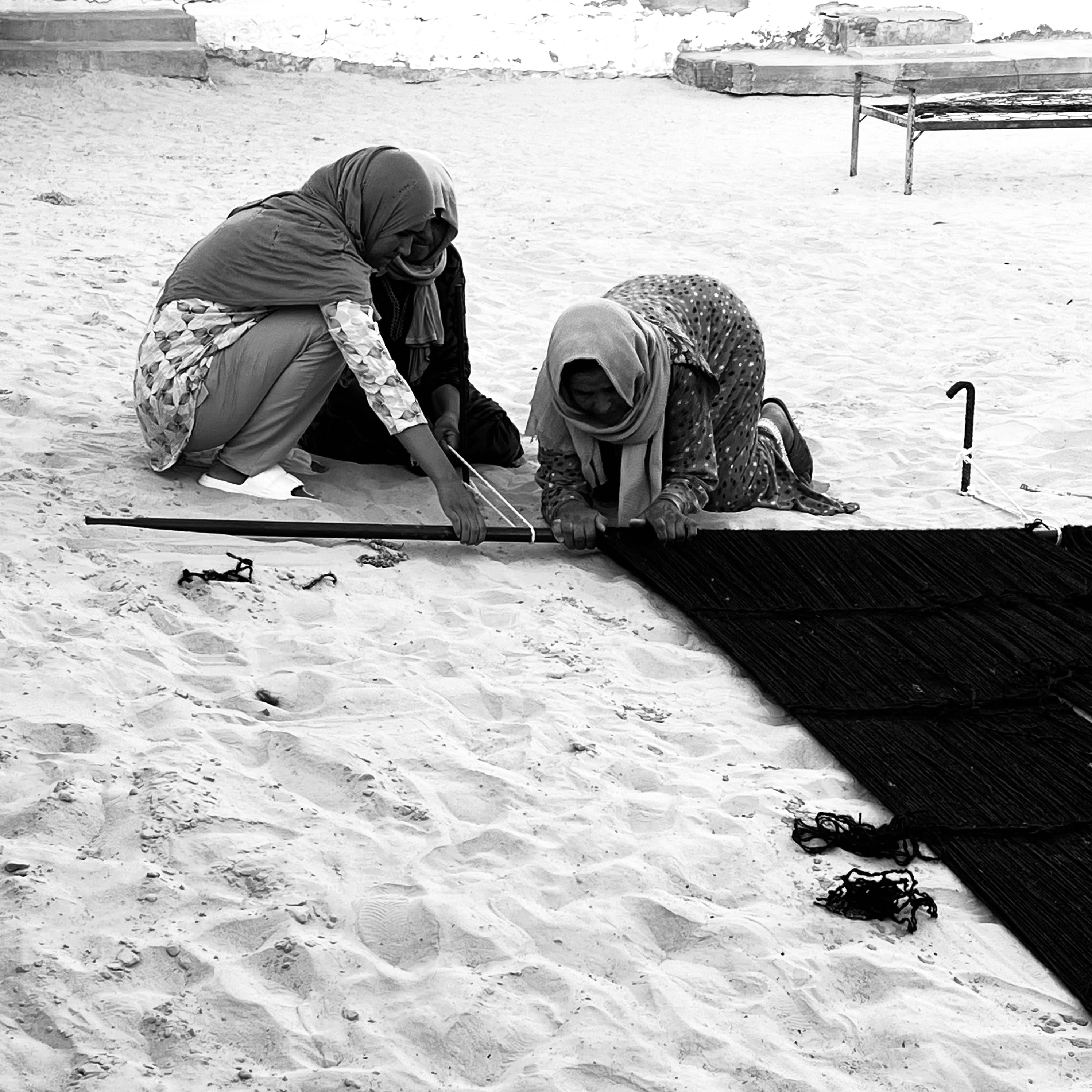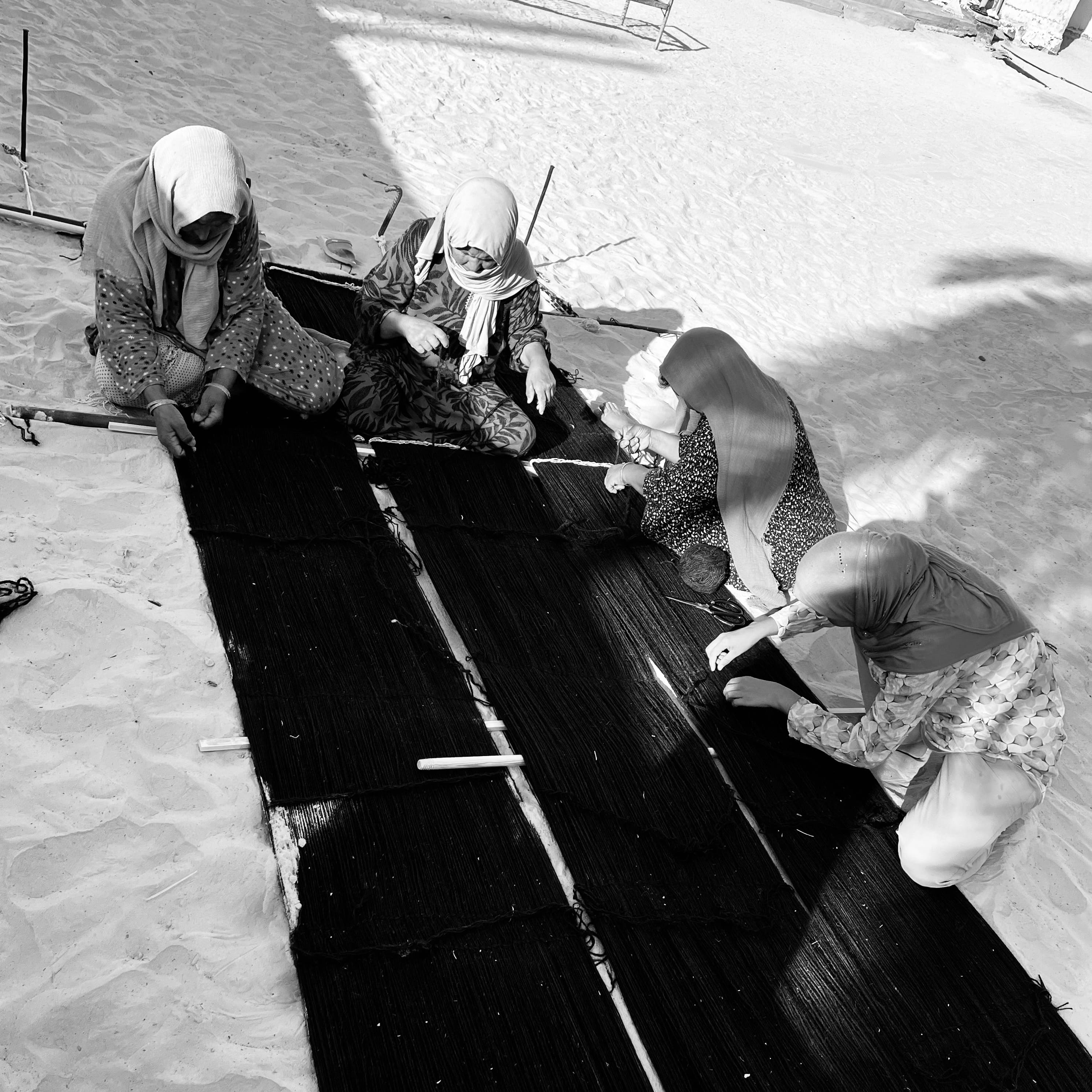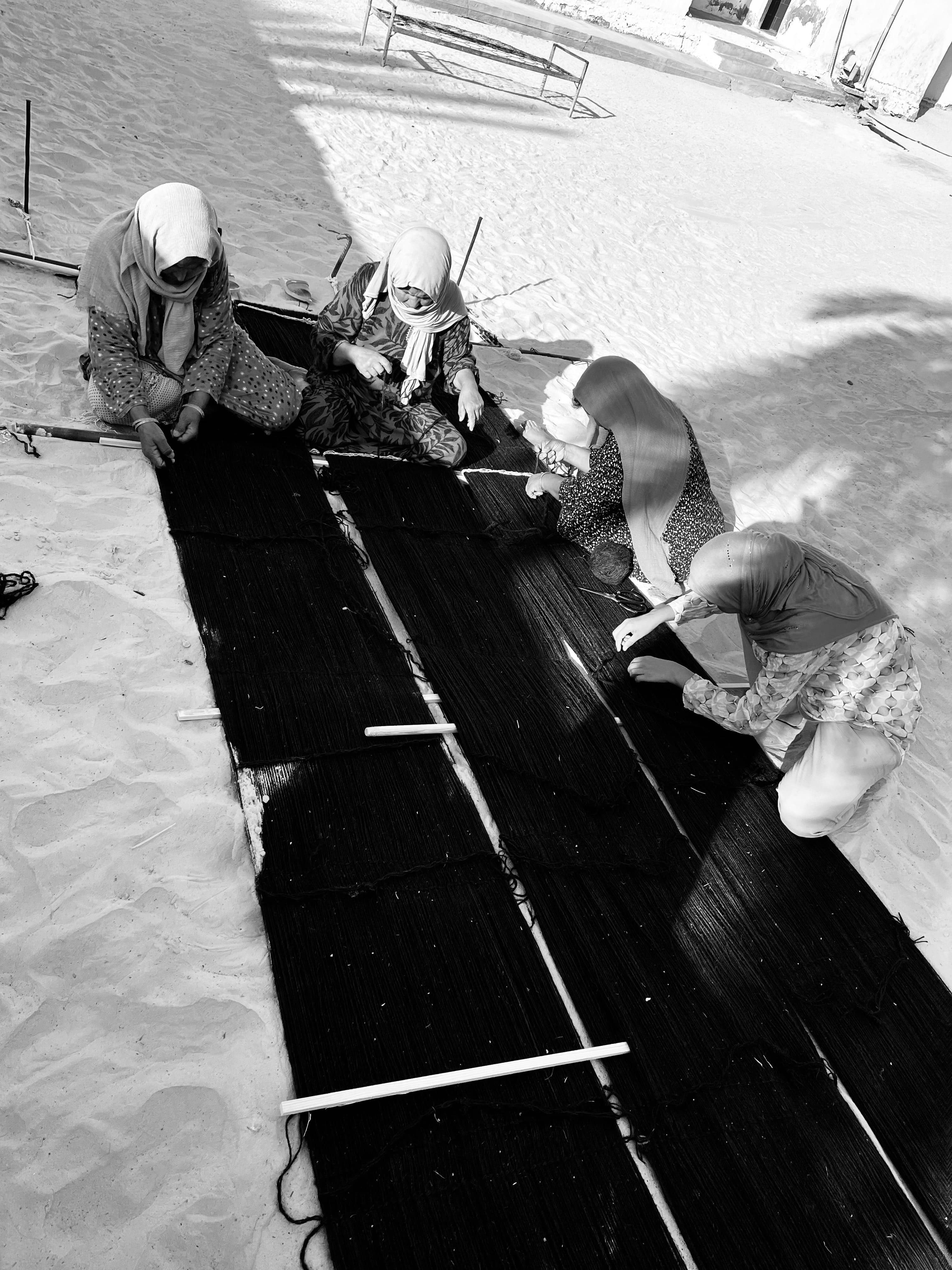 Centuries ago, the Mrazig people migrated from the Middle East, crossing Egypt and Libya before spreading across North Africa. By the end of the 12th century, they settled in southern Tunisia, in Douz. Deeply connected to both the memory of their origins and the land that carries them, they continue this ancient weaving tradition. Even after settling, as if holding their breath, they remain ready to leave again. Each trembling thread carries within it the promise of a new journey.